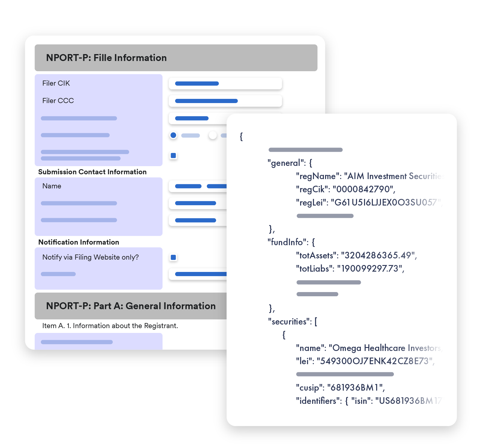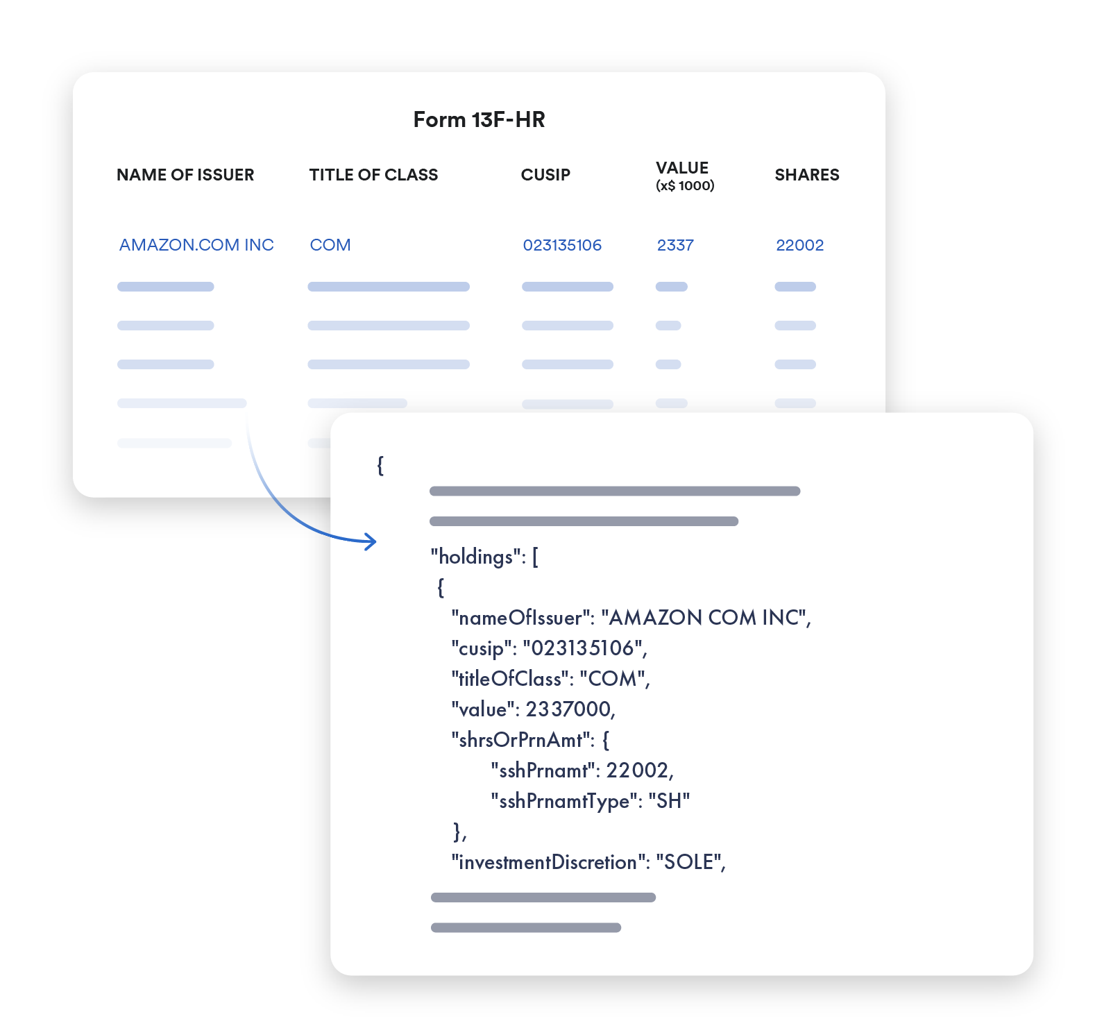Access SEC datasets through our standardized, fast-to-implement APIs, such as Form ADV data, SEC litigations and administrative proceedings, extracted sections from 10-K, 10-Q and 8-K filings, read and parse XBRL files, monitor executive compensation data, insider trading and institutional investment activity.