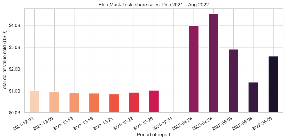 ax.set_title("Elon Musk Tesla share sales: Dec 2021 – Aug 2022")