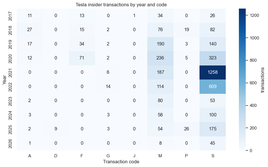 A year-by-code heatmap surfaces the dominant compensation codes (A — grants, M — option exercises, F — tax withholding) against the much rarer open-market activity (P, S). For most issuers, compensation codes utterly dominate Form 4 volume; the heatmap makes that imbalance visible at a glance and gives the reader a quick diagnostic for how to weight codes in downstream signal work.