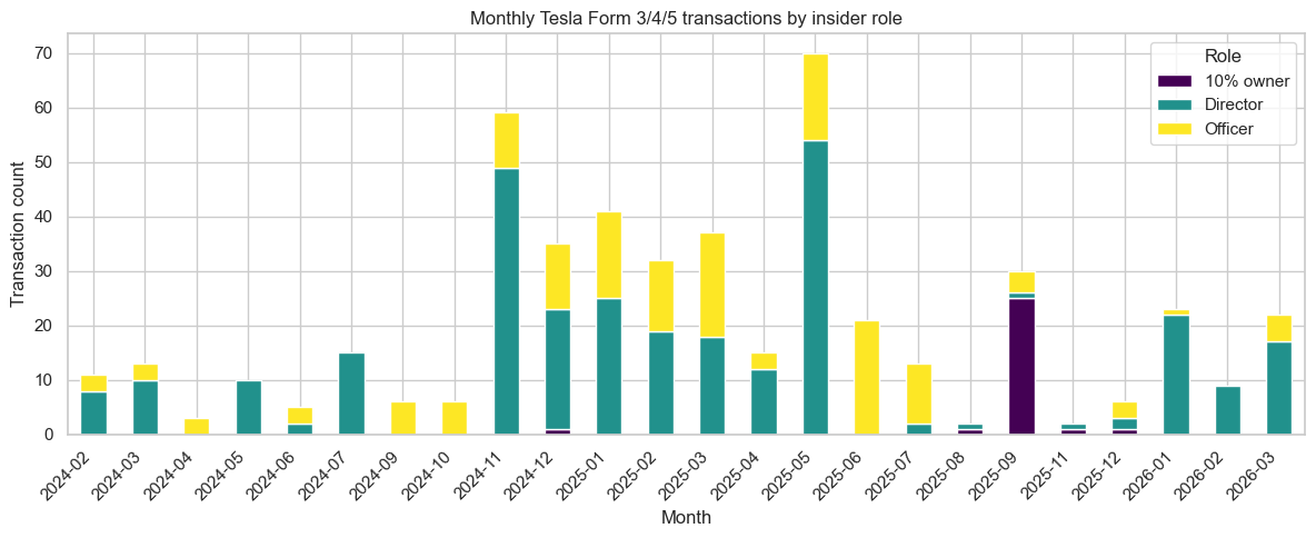 The three Section 16 role flags aren't mutually exclusive — an insider can simultaneously be director and officer and 10% owner. To produce a one-role-per-row chart we collapse to a single role column using an editorial priority: 10% owner > director > officer. You should change that priority to suit your own use case; for example, a compensation analyst might prefer officer > director > 10% owner so that executive pay-driven trades are separated from independent-director activity first. The chart below stacks monthly transaction counts by role for the paginated Tesla pull from Query 6.